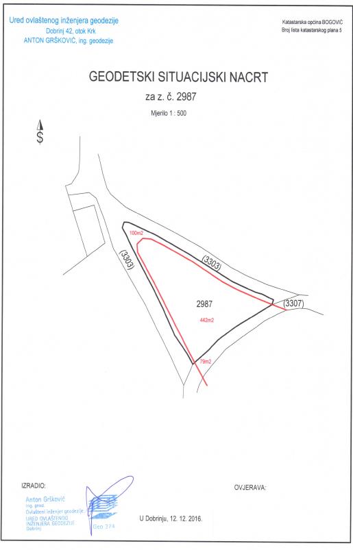 – dio z.č. 3307 k.o. Bogović, upisane u z.k.ul. 5512 kod Općinskog suda u Rijeci, Stalna služba u Krku, površine 79 m2, označen na Geodetskom situacijskom nacrtu od 12. prosinca 2016. godine izrađenom od Ureda ovlaštenog inženjera geodezije Antona Gršković iz Dobrinja, koji je sastavni dio ovog Natječaja.