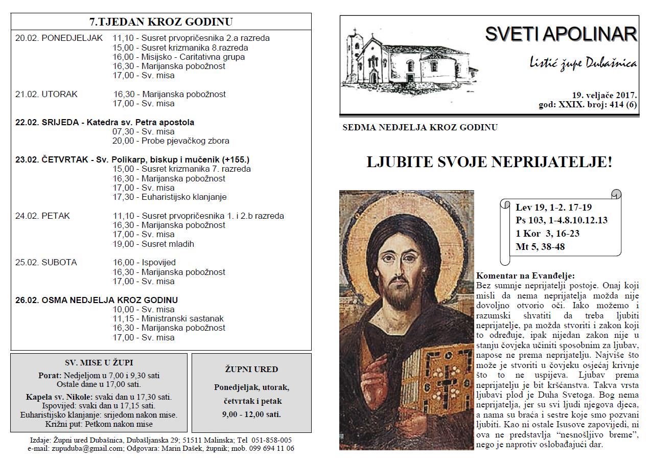 Župa Svetog Apolinara 7. nedjelja kroz godinu 18. veljače 2017.18. veljače 2017.1 min read Općina Malinska - Dubašnica Post Views: 158 Share