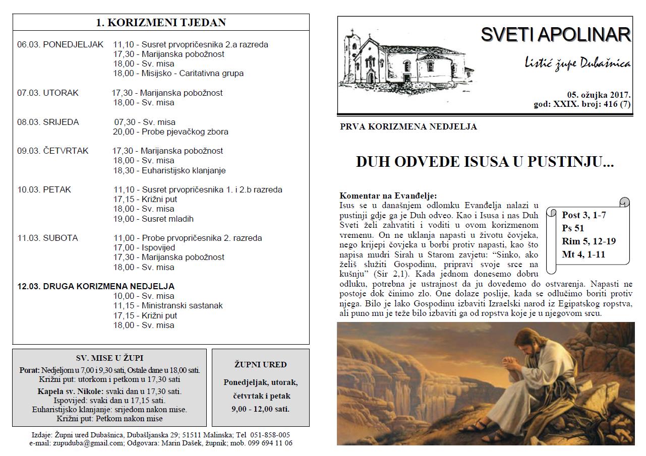 Korizma, Sveti Apolinar, Župa, Župa Dubašnica, Župni listić