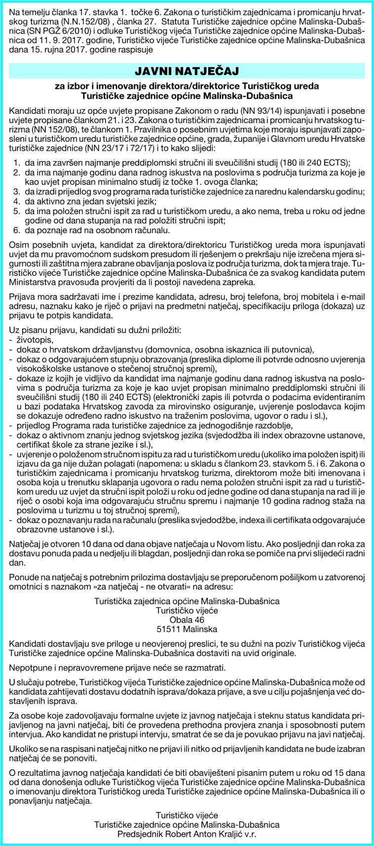 Natječaji Javni natječaj za izbor i imenovanje direktora/direktorice Turističkog ureda TZO Malinska – Dubašnica 15. rujna 2017.25. rujna 2017.1 min read Općina Malinska - Dubašnica Post Views: 149 Share