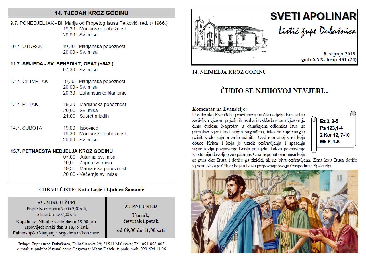 Listić svetoga Apolinara, Sveti Apolinar, Župa Dubašnica, Župa Svetog Apolinara, Župni listić