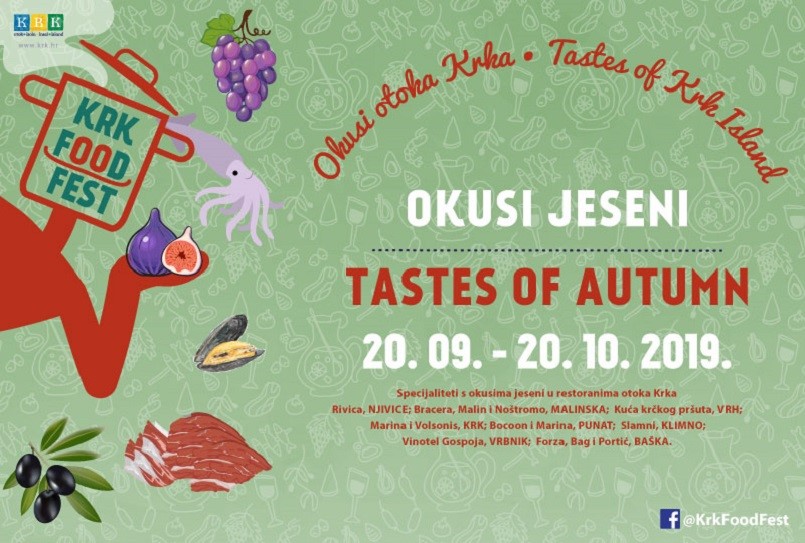 Na otoku Krku se od 20.09.-20.10.2019. u 14 restorana održava manifestacija Krk Food Fest: Okusi jeseni. Krk nosi u sebi tragove antičkih vremena i bogate srednjevjekovne povijesti, a prekrasna priroda i more ga okružuju uz bogatu arheološku i kulturnu baštinu nude i niz gastronomskih razloga za posjetu. Uz kvarnerske škampe, kozice, školjke, muzgavce i ribe, Krk je poznat po svojoj janjetini koja pase od mora slanu aromatičnu travu, po sorti grožđa i vina Žlahtina, po krčkom pršutu i siru, tjestenini šurlice koje na iglama za pletenje pripremaju krčke domaćice, samoniklom začinskom bilju, ekološki uzgojenom voću i povrću te maslinovom ulju iz krčkih maslinika.