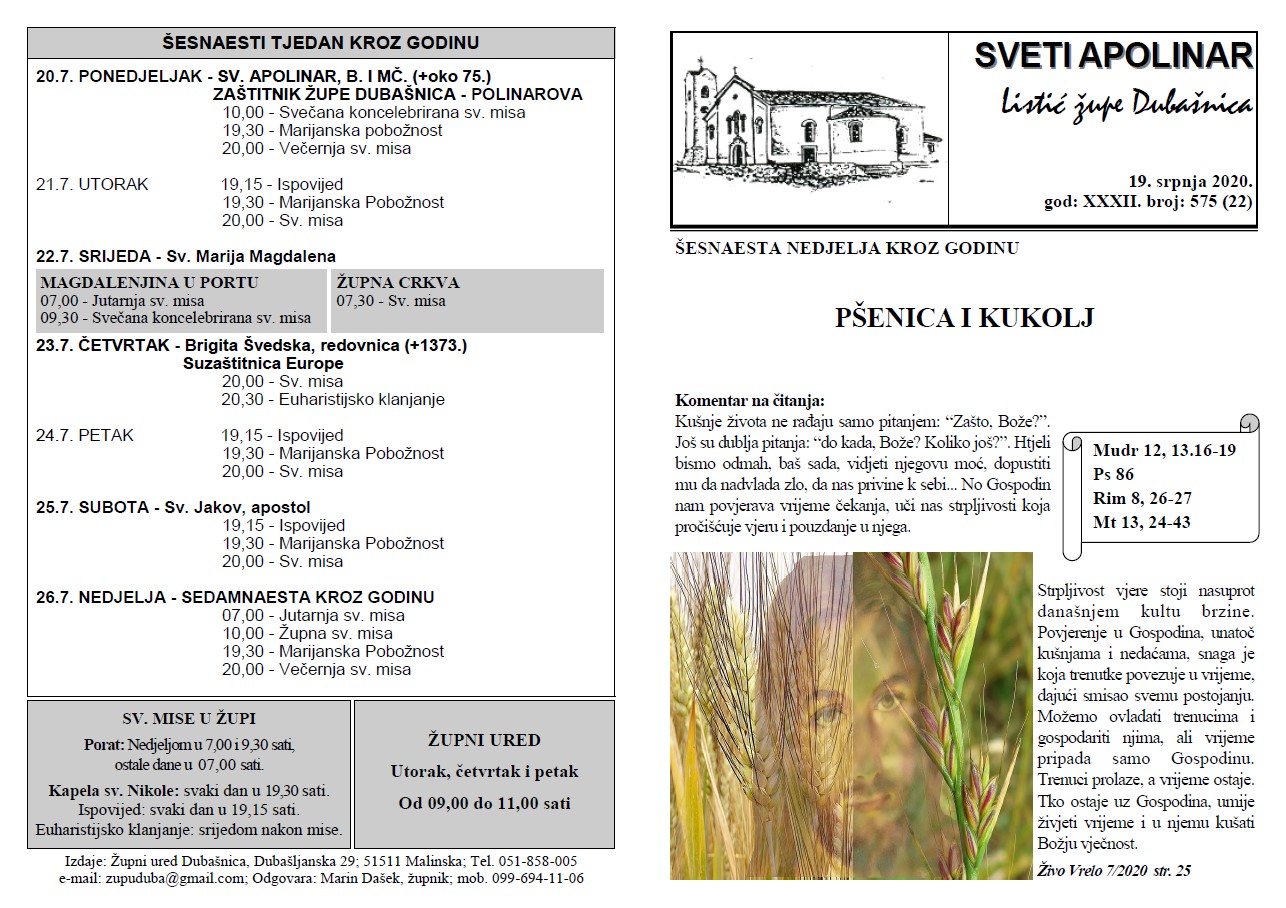 Župa Svetog Apolinara Šesnaesta nedjelja kroz godinu 18. srpnja 2020.19. srpnja 2020.1 min read Općina Malinska - Dubašnica Post Views: 161 Share