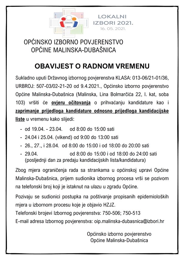 Lokalni izbori Lokalni izbori 2021: Zaprimanje kandidatura – obavijest o radnom vremenu 21. travnja 2021.1 min read Općina Malinska - Dubašnica ZAPRIMANJE KANDIDATURA Post Views: 198 Share