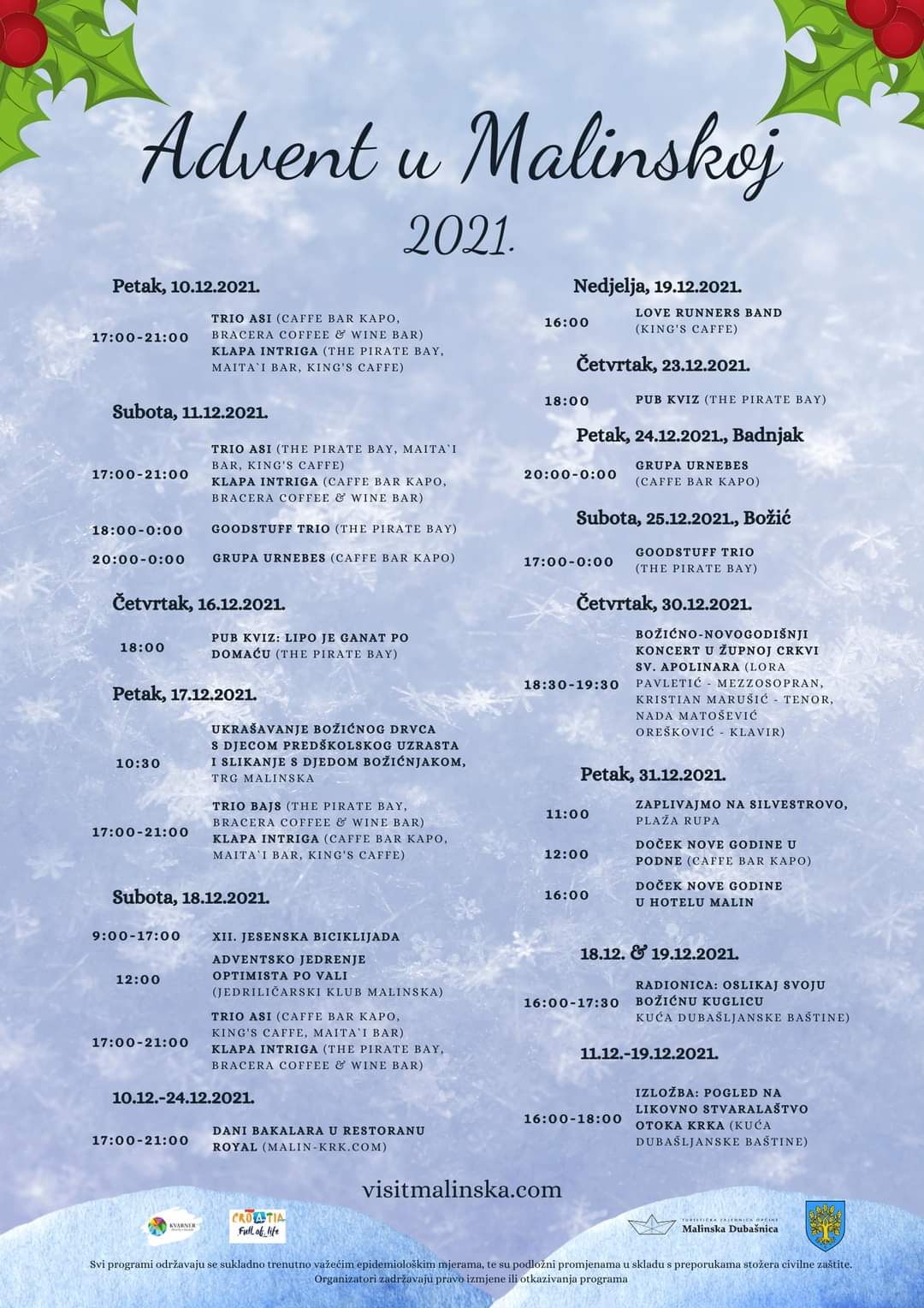 Zato uzmite za ruku svoje najdraže i provedite s nama ugodno predblagdansko vrijeme, uživajući u prigodnom i zabavnom programu koji smo pripremili za Vas! Očekuje Vas bogata ugostiteljska ponuda, glazbeni program, radionice, foto punkt i još mnogo toga – poručuju organizatori iz Turističke zajednice Općine Malinska-Dubašnica.