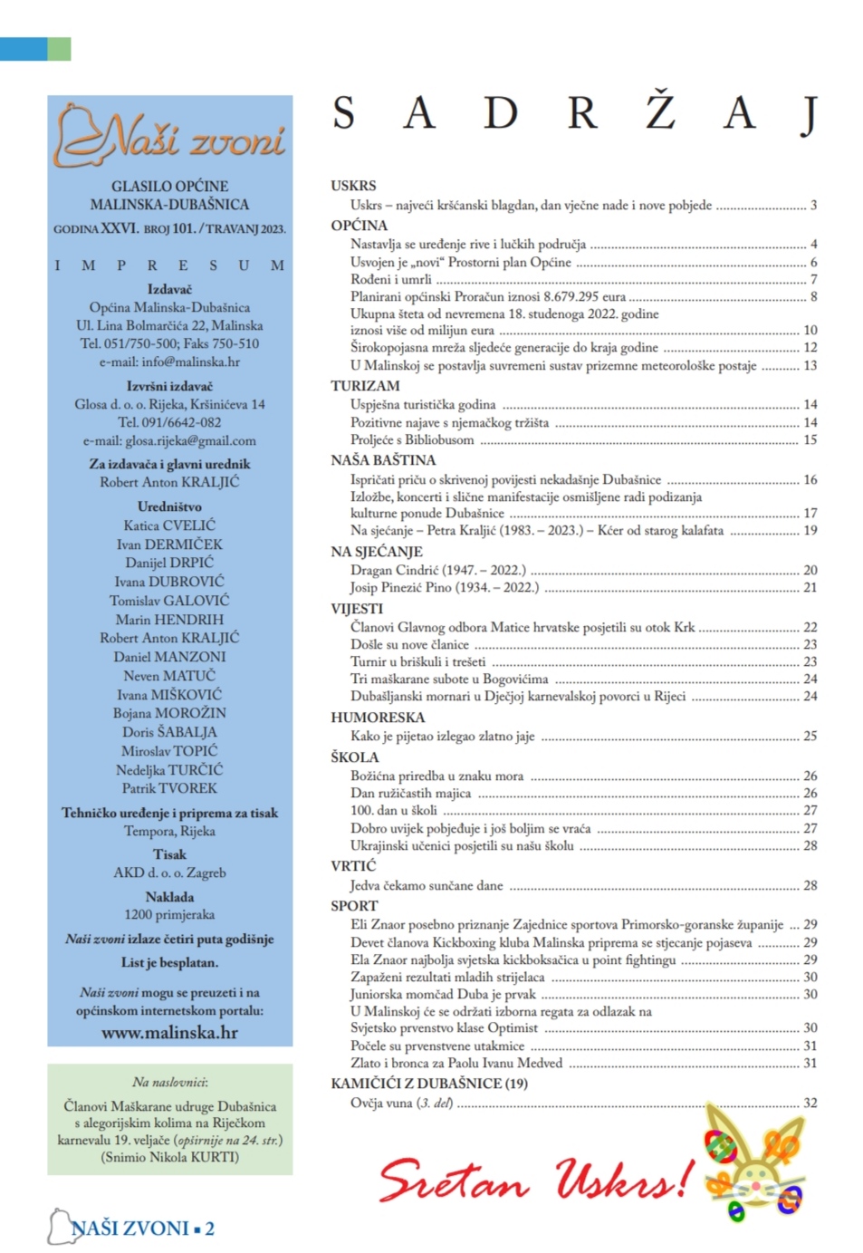 Naši zvoni Novi broj općinskog glasila Naši zvoni 2. travnja 2023.2. travnja 2023.1 min read Općina Malinska - Dubašnica Izašao je novi 101. broj Općinskog glasila Naši zvoni. Preuzmite: Naši zvoni (PDF) Prelistajte! Sretan Uskrs! Post Views: 537 Share