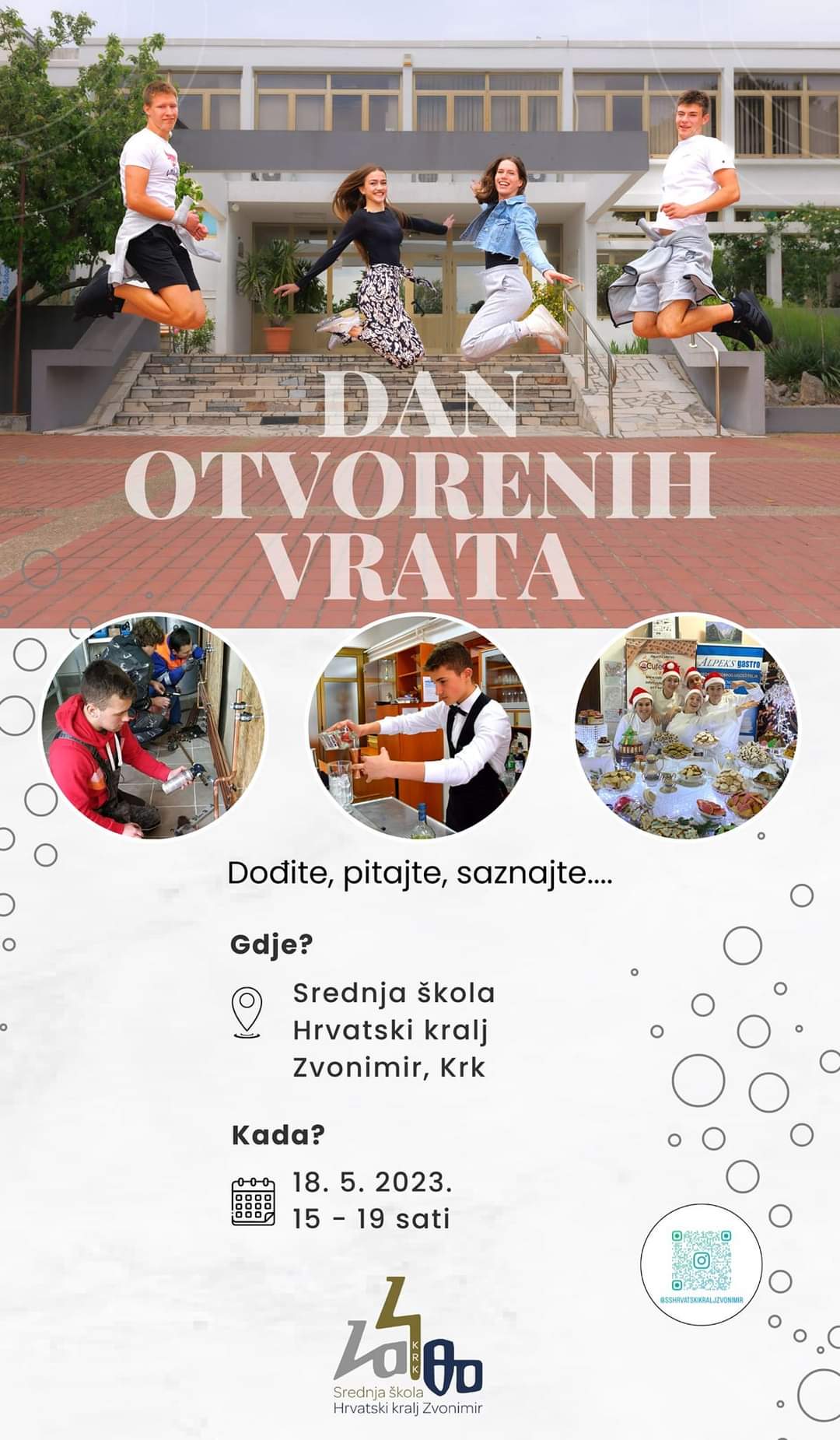 Dan otvorenih vrata u krčkoj srednjoj školi Hrvatski kralj Zvonimir, Krk održati će se 18. svibnja 2023. godine od 15:00 – 19:00 sati.
