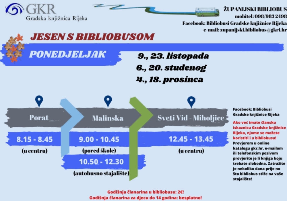 Gradska knjižnica Rijeka objavila je nadnevke dolaska Bibliobusa u Općinu Malinska – Dubašnica tijekom jeseni 2023. godine.