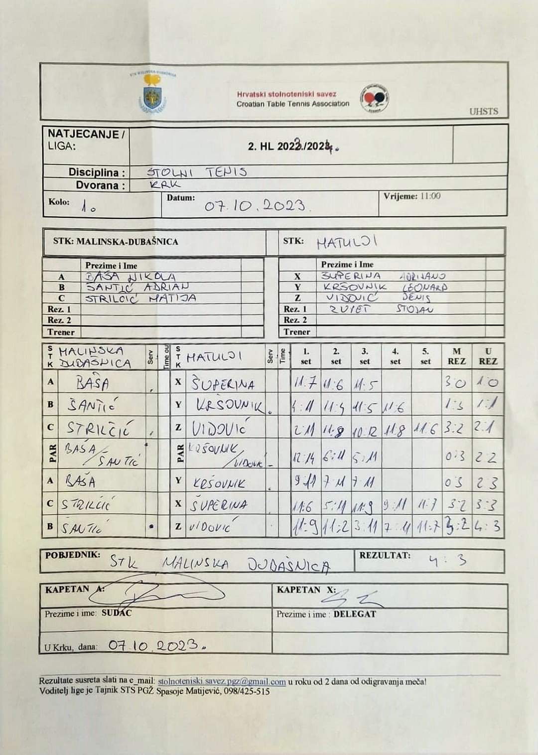 Dana 7. listopada 2023. godine, u 1. kolu 2. Hrvatske lige PIG regije ekipa STK Malinska – Dubašnica pobijedila je ekipu Matulja rezultatom 4.3.