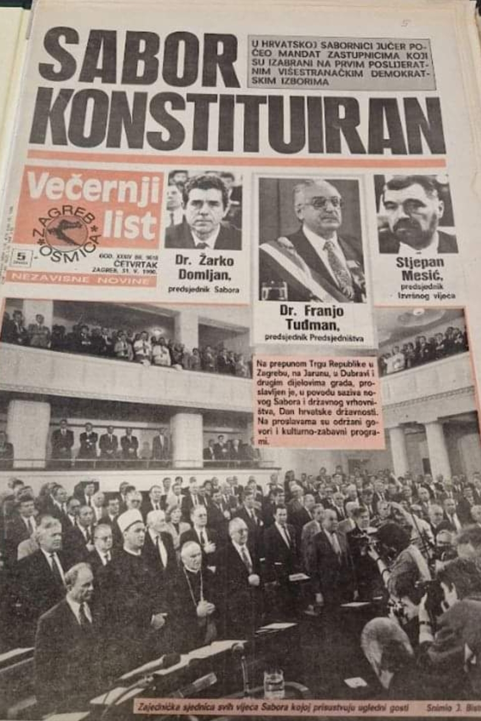 Za predsjednika Izvršnog vijeća Sabora izabran je Stjepan Mesić, a za predsjednika Predsjedništva Socijalističke Republike Hrvatske Franjo Tuđman koji je u svom prvom govoru pred novoizabranim zastupnicima naglasio kako konstituiranje prvog višestranačkog Sabora predstavlja prvi korak na povratku hrvatskoga naroda i njegove države europskoj civilizacijskoj, političkoj, kulturnoj i gospodarskoj tradiciji.