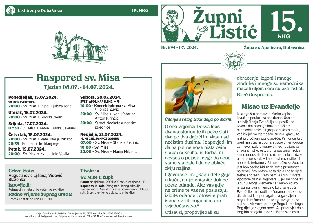 Župa Svetog Apolinara 15. nedjelja kroz godinu 13. srpnja 2024.15. srpnja 2024.1 min read Općina Malinska - Dubašnica Preuzmite:Listić svetog Apolinara (PDF) Post Views: 95 Share