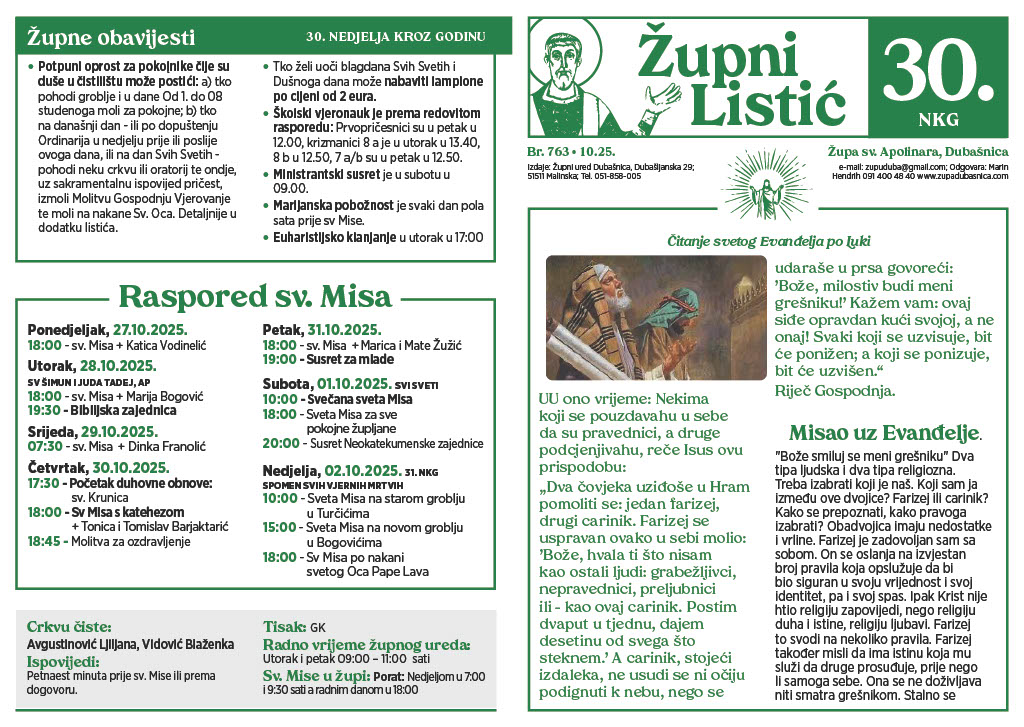 Župa Svetog Apolinara 30. nedjelja kroz godinu 25. listopada 2025.8. studenoga 2025.1 min read Općina Malinska - Dubašnica Preuzmite: Listić Svetog Apolinara (PDF) Post Views: 4 Share