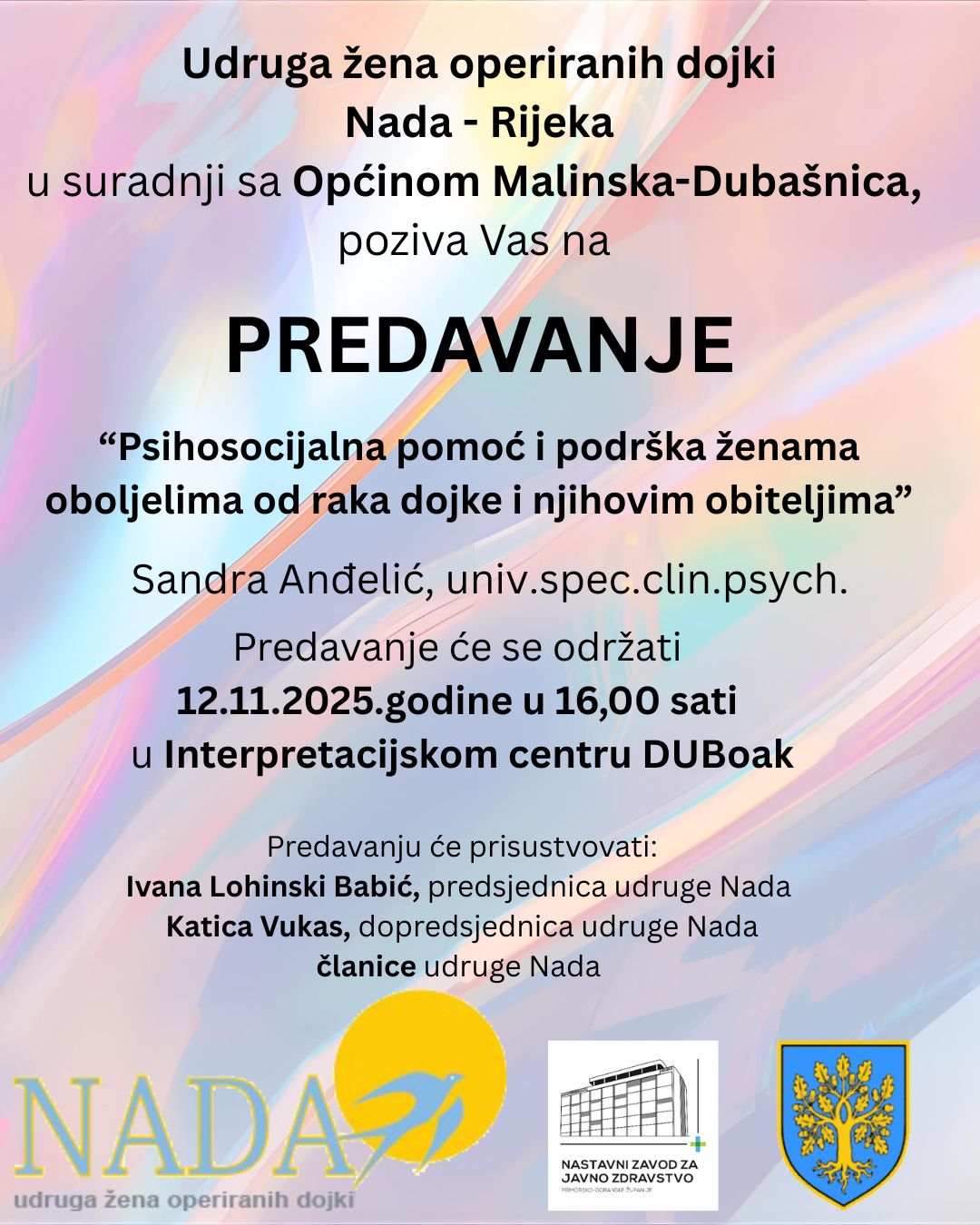 Vijesti Život Udruga NADA – psihosocijalna pomoć i podrška ženama oboljelima od raka dojke i njihovim obiteljima 31. listopada 2025.1 min read Općina Malinska - Dubašnica Post Views: 27 Share