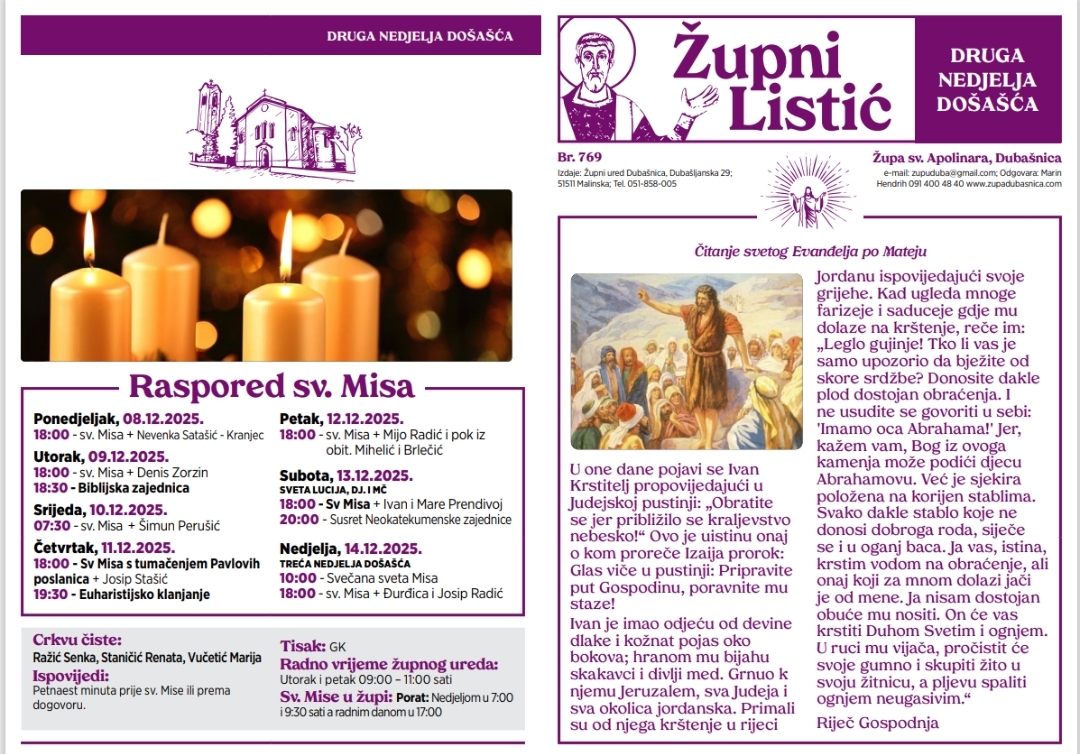 Župa Svetog Apolinara 2. nedjelja Došašća 6. prosinca 2025.15. prosinca 2025.1 min read Općina Malinska - Dubašnica Preuzmite: Listić Svetog Apolinara (PDF) Post Views: 62 Share