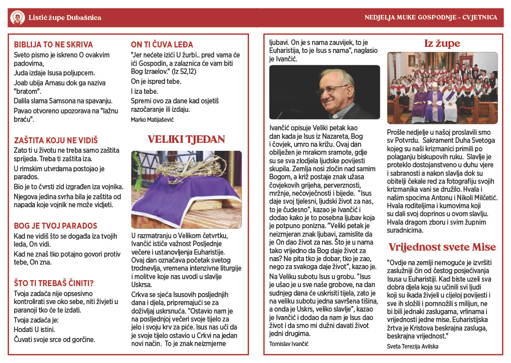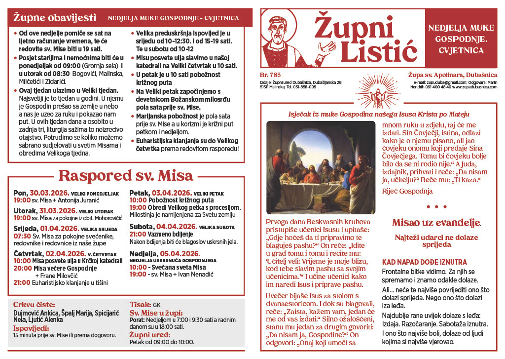 Župa Svetog Apolinara Nedjelja muke Gospodnje – CVJETNICA 28. ožujka 2026.31. ožujka 2026.1 min read Općina Malinska - Dubašnica Preuzmite: Listić svetog Apolinara (PDF) Post Views: 162 Share